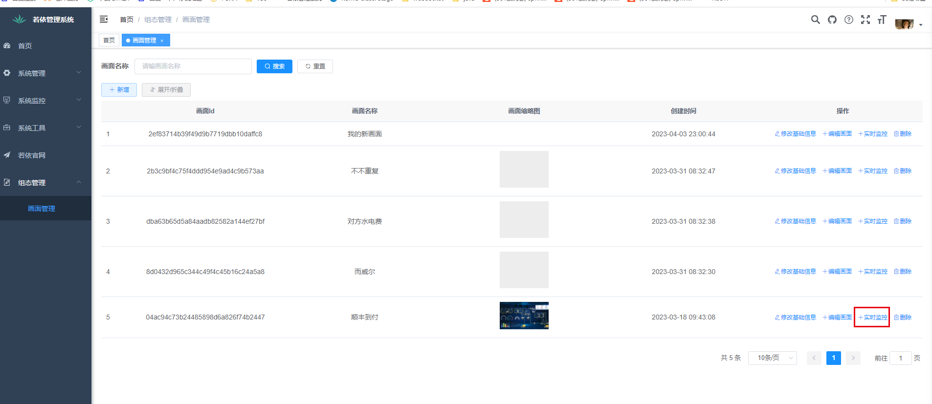 4编辑器和实时监控的组件都有了,这时候你们就可以在项目中需要用到的地方,去调用这两个vue组件了。我们的例子项目里是在 画面列表 菜单里面用的,分别是在【新增】【编辑画面】【实时监控】的时候用的,如下图。